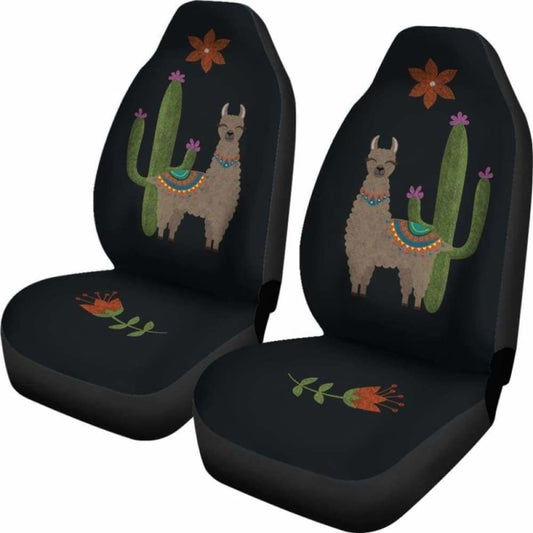 Brown Llama Car Seat Covers Chalky Style Cactus And Flower Design Printed On Black Fabric
