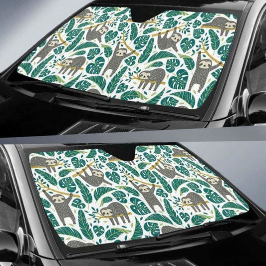 Cute Sloths Tropical Palm Leaves White Background Car Auto Sun Shades