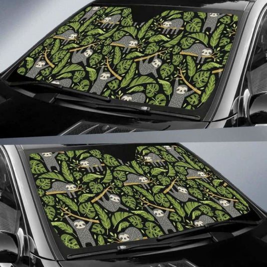 Cute Sloths Tropical Palm Leaves Black Background Car Auto Sun Shades