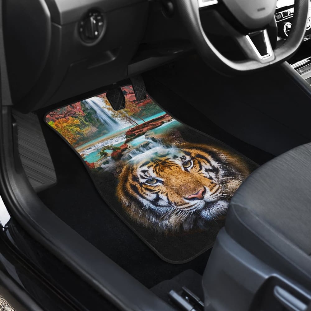 Powerful Brown Tiger with Amazing Waterfall Car Floor Mats
